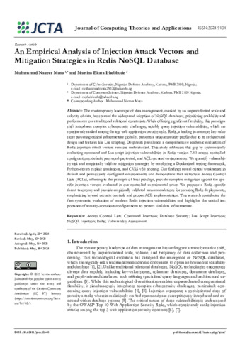 Musa, Muhammad Nazeer and Irhebhude, Martins Ekata (2025) An Empirical Analysis of Injection Attack Vectors and Mitigation Strategies in Redis NoSQL Database. Journal of Computing Theories and Applications, 2 (4). pp. 553-571. ISSN 3024-9104