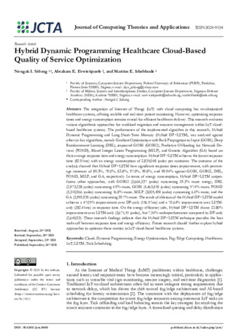 Sitlong, Nengak I. and Evwiekpaefe, Abraham E. and Irhebhude, Martins E. (2025) Hybrid Dynamic Programming Healthcare Cloud-Based Quality of Service Optimization. Journal of Computing Theories and Applications, 3 (2). pp. 115-131. ISSN 3024-9104