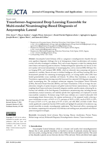 Asuai, Clive and Andrew, Mayor and Arinomor, Ayigbe Prince and Ogheneochuko, Daniel Ezekiel and Joseph-Brown, Aghoghovia Agajere and Merit, Ighere and Collins, Atumah (2025) Transformer-Augmented Deep Learning Ensemble for Multi-Modal Neuroimaging-Based Diagnosis of Amyotrophic Lateral Sclerosis. Journal of Computing Theories and Applications, 3 (2). pp. 190-205. ISSN 3024-9104