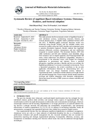 Muh Dliyaul, Haq and Nova Tri, Prasetiyo and Aris, Setianto (2025) Systematic Review of AppSheet-Based Attendance Systems: Outcomes,Features, and Sectoral Adoption. Journal of Multiscale Materials Informatics, 2 (2). pp. 1-15. ISSN 3047-5724