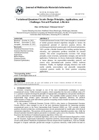 Dian Arif, Rachman and Muhamad, Akrom (2025) Variational Quantum Circuits Design Principles, Applications, and Challenges Toward Practical: A Review. Journal of Multiscale Materials Informatics, 2 (2). pp. 16-29. ISSN 3047-5724